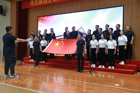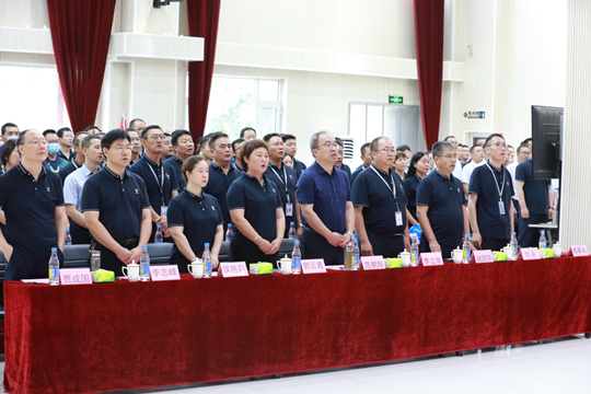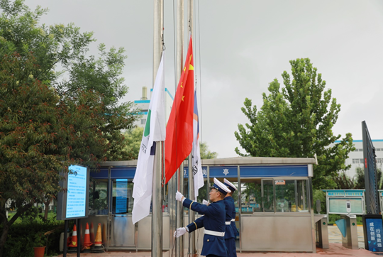 2022年7月26日上午8點(diǎn)08分,一場隆重的升旗儀式拉開了慶典活動(dòng)的帷幕,黨委副書記王興武主持升旗儀式,升旗手護(hù)送國旗、司旗入場,全場人行注目禮,隨著高亢的國歌聲,三面旗幟緩緩上升,在朝陽中迎風(fēng)飄揚(yáng)。